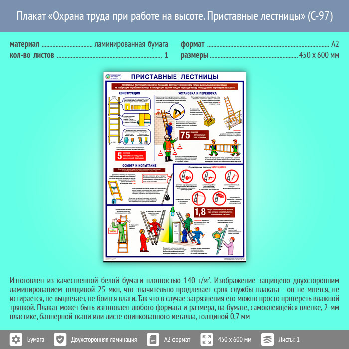 Плакат «Охрана труда при работе на высоте. Приставные лестницы» (С-97, ламинированная бумага, А2, 1 лист) в Иркутске купить