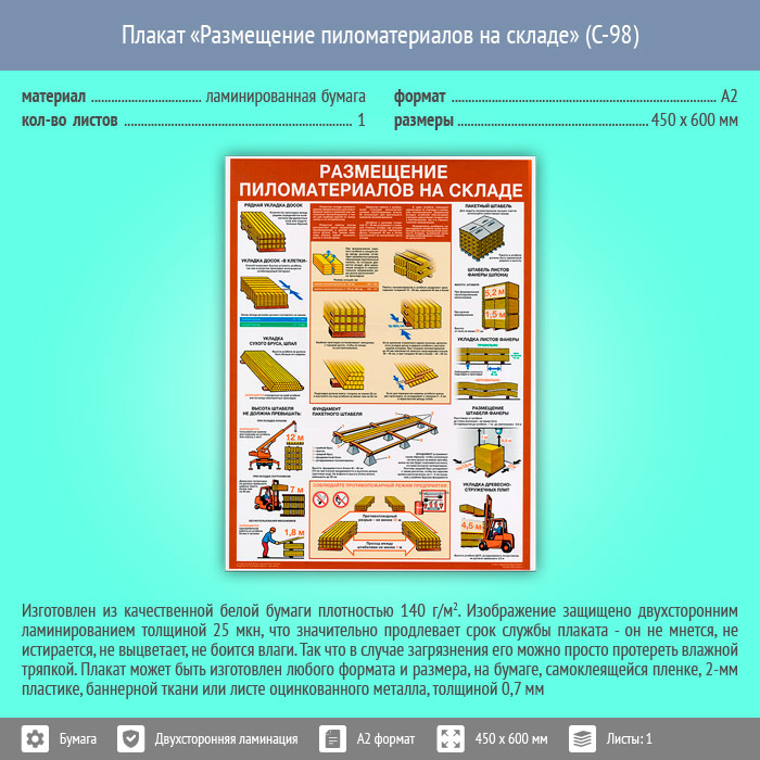 Плакат «Размещение пиломатериалов на складе» (С-98, ламинированная бумага, А2, 1 лист) в Иркутске купить