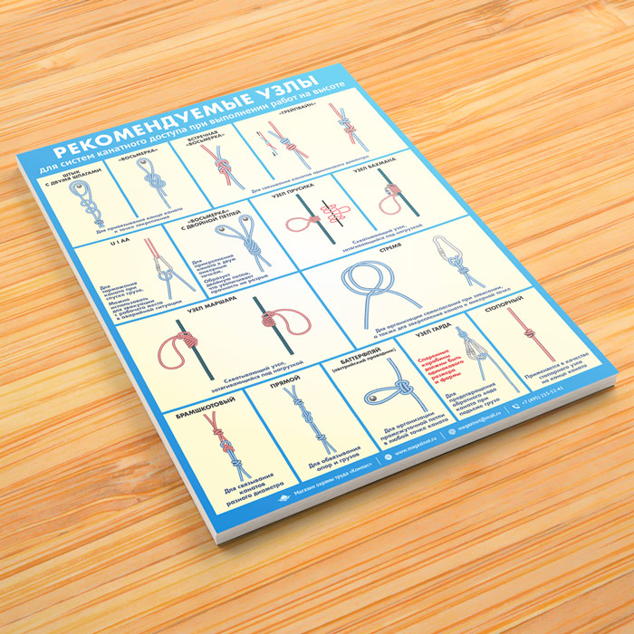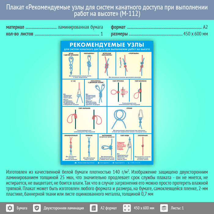 Плакат «Рекомендуемые узлы для систем канатного доступа при выполнении работ на высоте» (М-112, ламинированная бумага, А2, 1 лист) в Иркутске купить