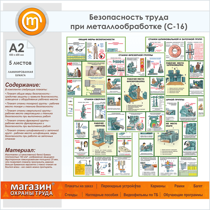 Плакат «Безопасность работ на металлообрабатывающих станках» (С-16, ламинированная бумага, А2, 5 листов) в Иркутске купить