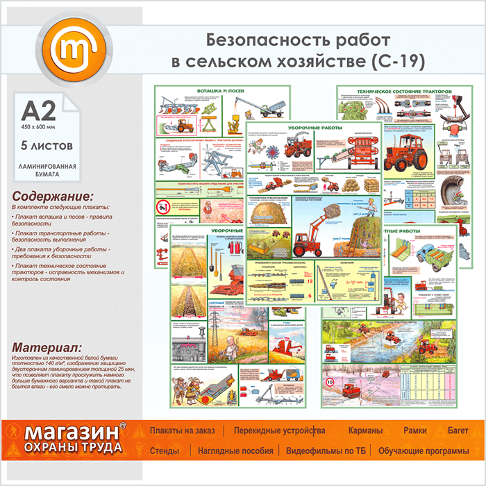 Плакаты «Безопасность работ в сельском хозяйстве» (С-19, ламинированная бумага, А2, 5 листов) в Иркутске купить