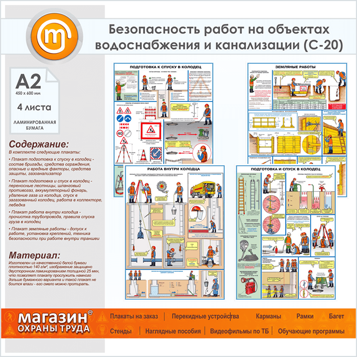 Плакаты «Безопасность работ на объектах водоснабжения и канализации» (С-20, ламинированная бумага, А2, 4 листа) в Иркутске купить