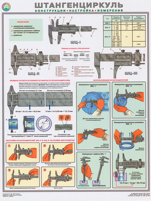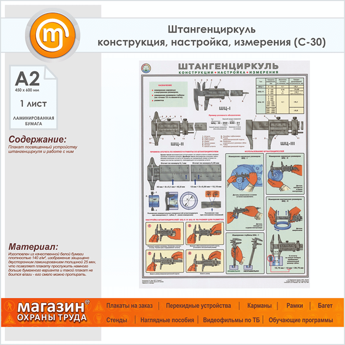 Плакат «Штангенциркуль - конструкция, настройка, измерения» (С-30, ламинированная бумага, А2, 1 лист) в Иркутске купить